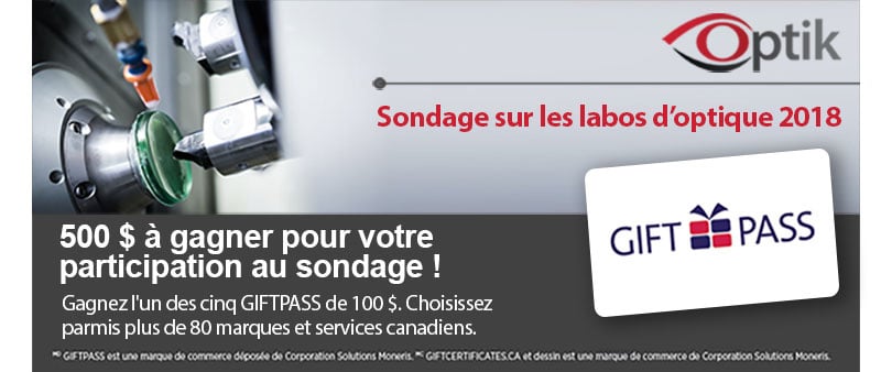 Répondez à ce sondage se réalisant en 10 minutes et participez à notre concours sur les laboratoires d–optique dont les prix totalisent de 500 $. Voir les règlements du concours ici.