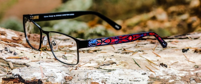 Cette monture a clairement été conçue pour les grands visages ! Surdimensionnée et racée, la monture Jacob d–AYA Optical met en valeur le poisson-chat, ou maanameg : l–enseignant des enseignants, le maître de l–apprentissage, qui nous enseigne que la Terre et tous ses habitants peuvent nous transmettre la connaissance et le savoir. Ce modèle est proposé avec une face en métal noir mat ou argent satiné et des branches en acétate noir. Il est aussi équipé de charnières à ressort, qui procurent une flexibilité accrue, et de plaquettes ajustables.
