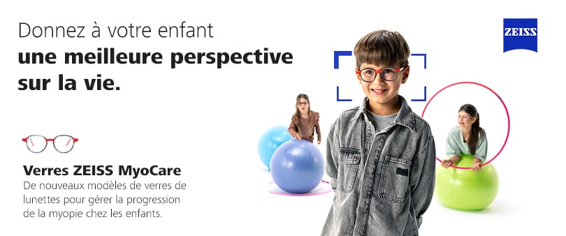 Verres ZEISS MyoCare : Une efficacité et une vision décontractée en un seul verre Différentes méthodes ont été développées et testées pour gérer la progression de la myopie, notamment les lunettes, les lentilles de contact et les gouttes ophtalmiques. ZEISS se concentre sur la gestion globale de la myopie, dont les verres de lunettes innovants constituent un élément important. ZEISS MyoCare est un nouveau modèle de verre de lunettes efficace et cliniquement testé qui intègre plus de dix ans de pratiques de gestion de la myopie de ZEISS, y compris des verres de lunettes spéciaux et des connaissances scientifiques sur l'utilisation des lentilles de contact en orthokératologie.